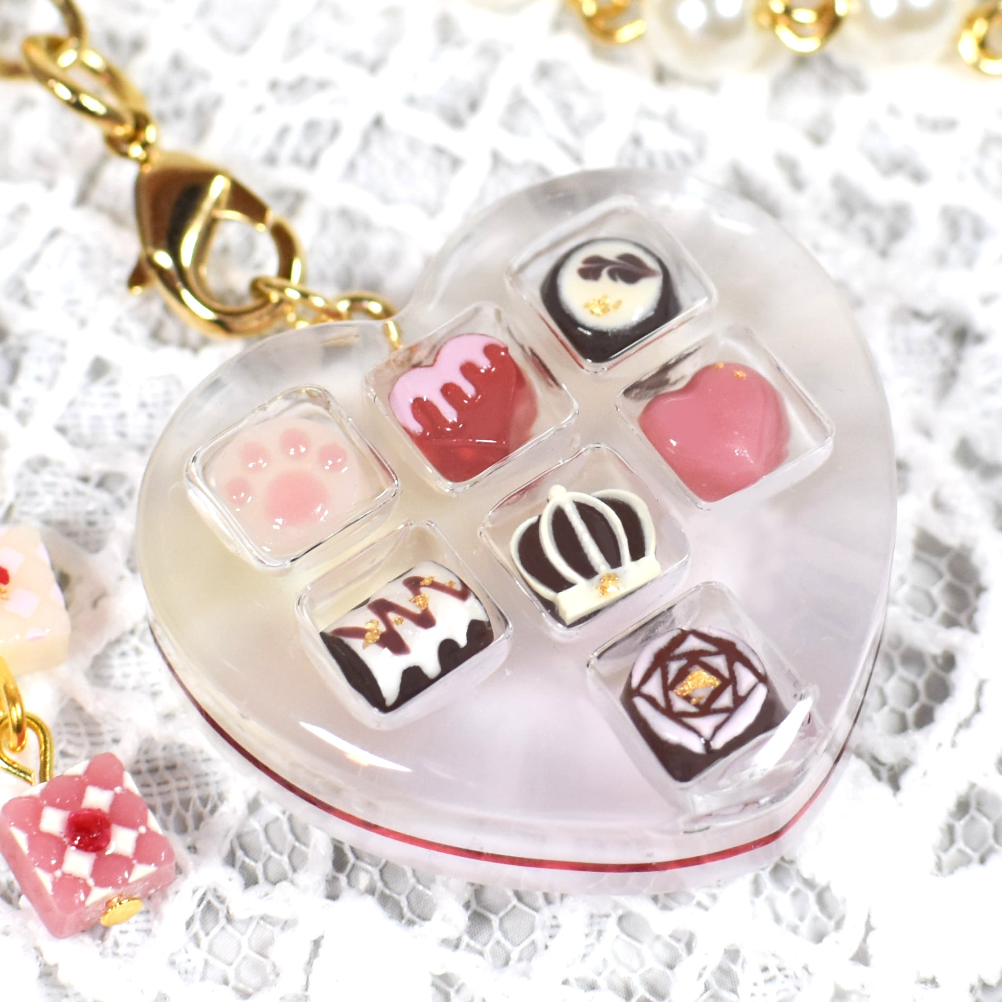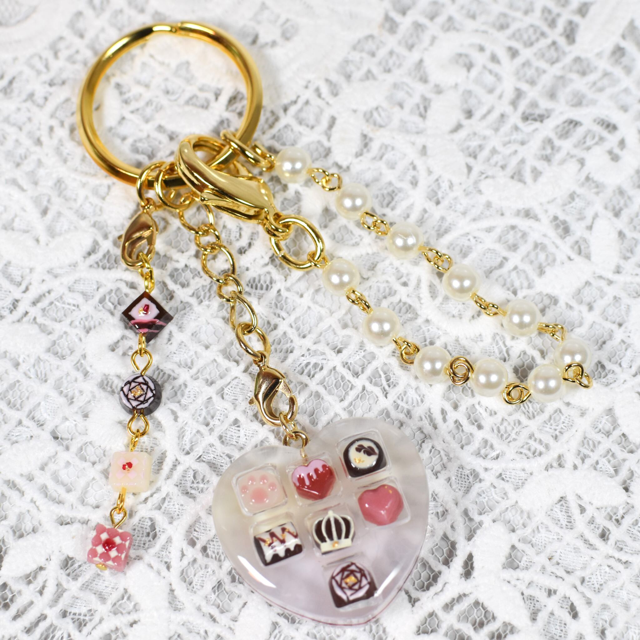 こちらは1粒ずつ手作業で作成したチョコレートモチーフのバッグチャームです。振ると中のチョコレートが少し動く仕様になっております。